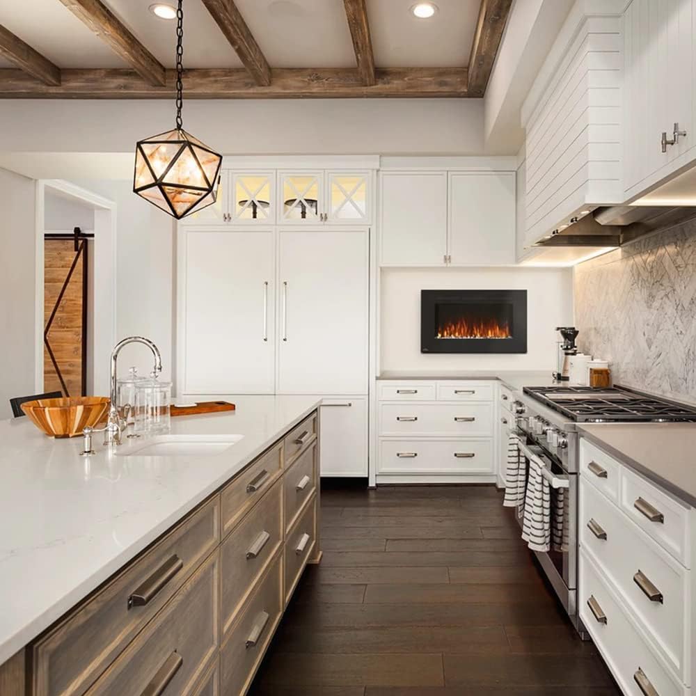 The fireplace features LED lit dancing flame effects with crystal cube ember bed. You can choose from three flame color options: