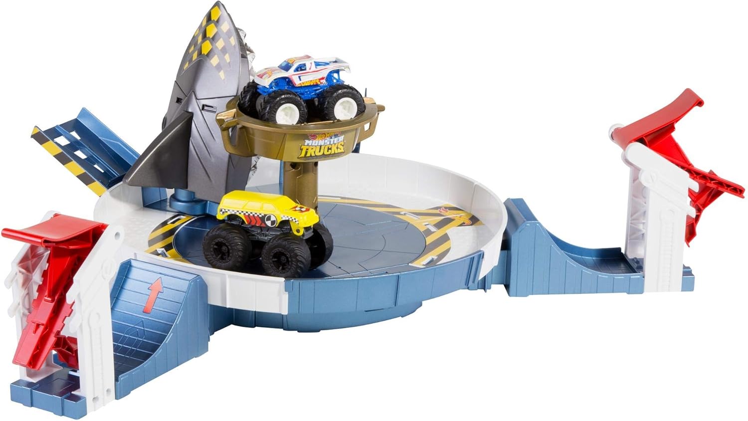Image showing the fully assembled Hot Wheels Monster Trucks Mecha Shark FACE-Off Play Set, featuring the circular arena, two launchers, the central trophy, and the mechanical shark structure. Two monster trucks are placed on the set.