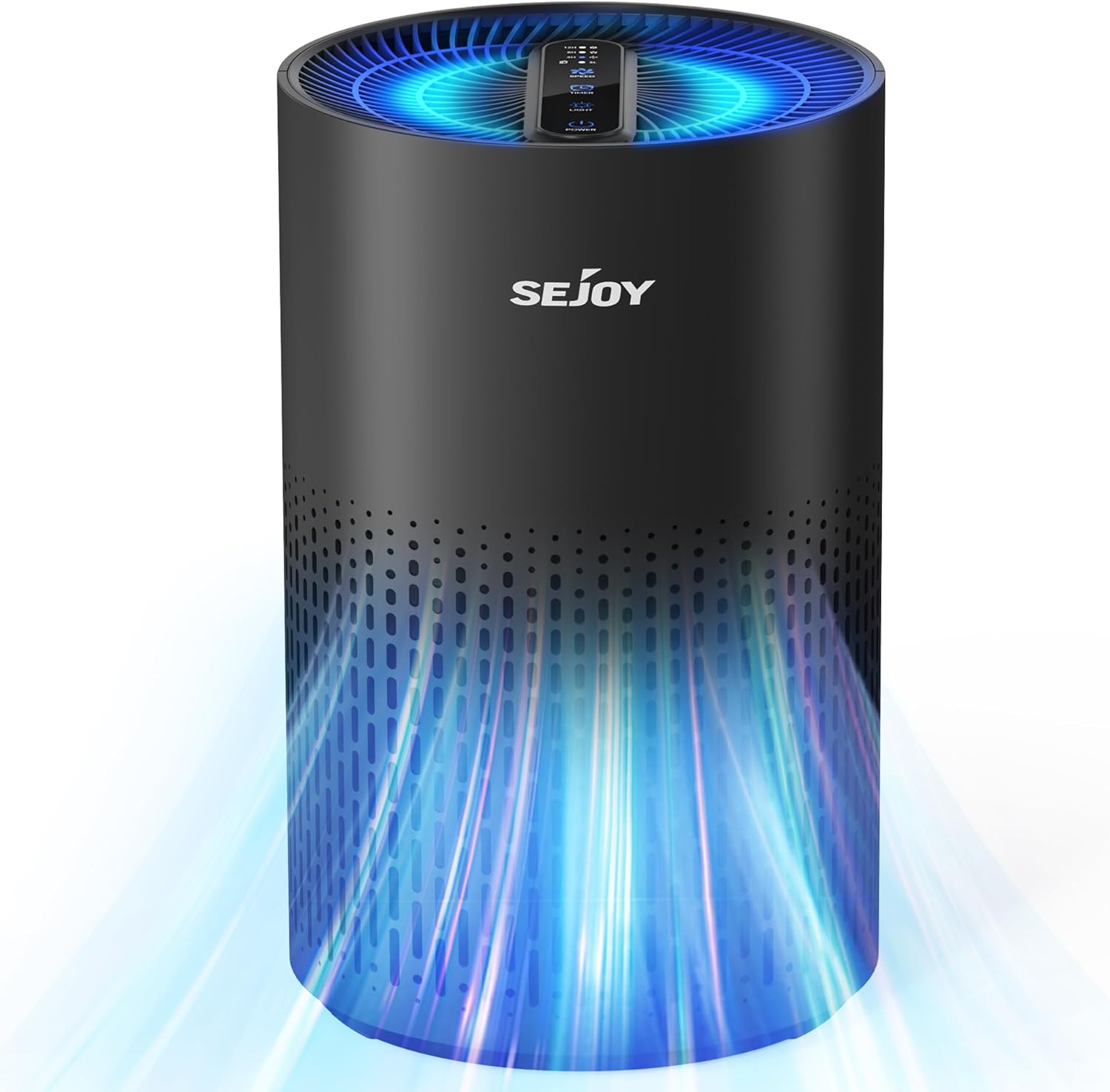 The Sejoy KJ100F is a compact air purifier designed for bedrooms and other small to medium-sized rooms. It features a 3-stage filtration system, multiple fan speeds, a quiet sleep mode, and an ambient night light.